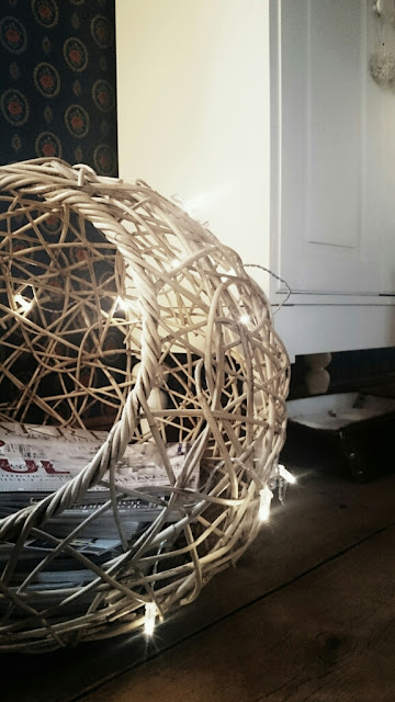 Pero antes...unos minutos de relax, un café y algo de inspiración que almaceno en mi gran bola de mimbre...a la que también he dado un toque de luz :)